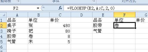 5. 如=VLOOKUP(E2,A:C,2,0),就是在A列中查找E2单元格,并返回同行B列的值;