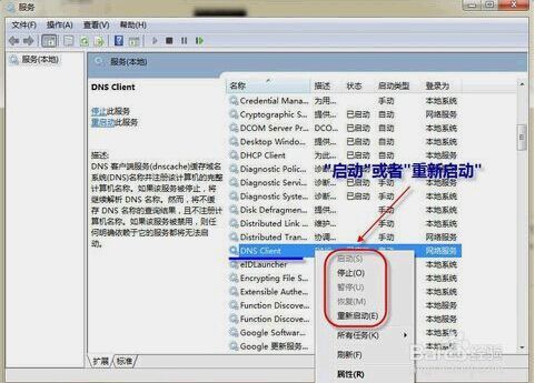 4、在命令行窗口输入“services.msc”,或者通过“控制面板”-》“管理工具”-》“服务”,进入服务管理窗口。启动“dns client”服务后,再在命令行窗口执行“ipconfig /flushdns”命令,就能成功刷新本地的dns缓存了。