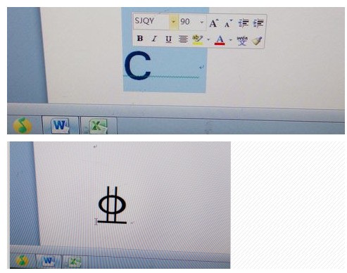 2)在默认字体宋体输入法下输入shift+c,在office2010版本中选中字母然后右键选择SJQY字体即可出现如下所示符号,