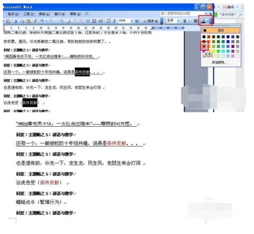 2.关闭对话框,单击某种字体颜色即完成对查找到的字符或词汇的标记。比如这里选中是醒目的红色标记。