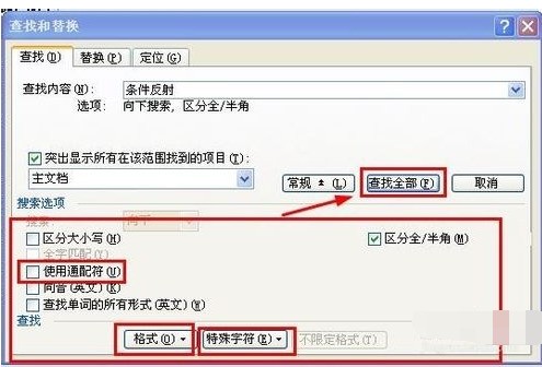 2.在弹出的高级下拉框项中:在“使用通配符”前打上对勾—— 最后单击“查找全部”即可选中所查找的重复的词组。