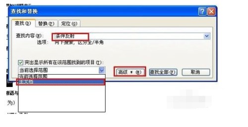 比如刚才查找时输入的是“条件反射”。点击“查找全部”后即对文档中的“条件反射”这个词都选中了。