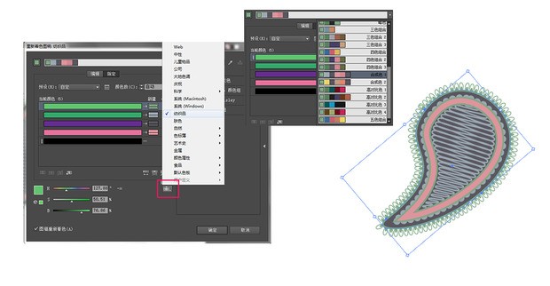 你还可以点选“将颜色组限定为某一色板中的颜色”来打开相应的色板并选择相应的协调规则。例如,我在此选择纺织品的合成色,图案配色就发生了如下改变。