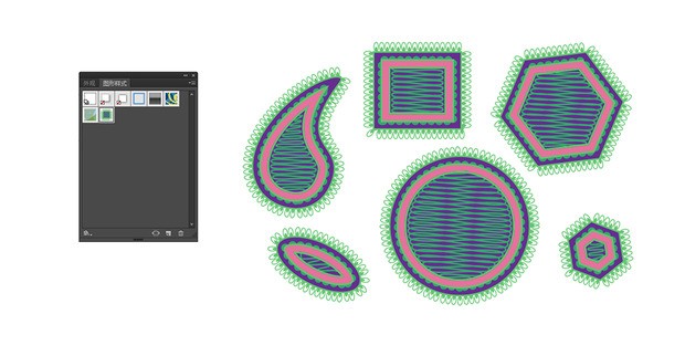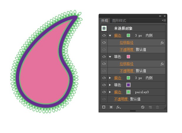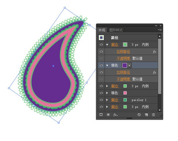 你是否领会到外观的使用方法一二呢?这时再为图形继续添加新填充和新描边,填充为紫色,描边为绿色,位移路径-30px。