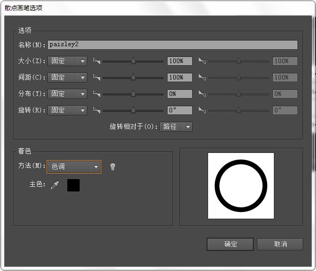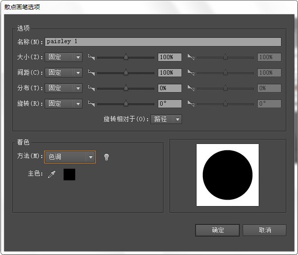 散点画笔的选项面板设置为默认值,改名为paisley1,将着色方法调整为“色调”,旋转相对于“路径”,点击确认。这里的选项是针对散点画笔的元素的样式进行的调整设置。