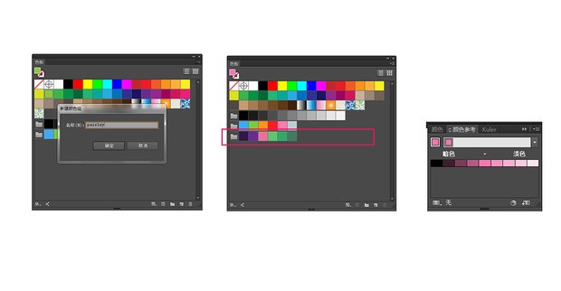 在进行图案创作前,请记得先进行配色色板的选择。如果在创作过程中再来调色的话,不利于创作本身的发挥。在此打开色板面板,在面板中新建一个颜色组,我在此选择紫色作为主打色,另外让绿色与它互补,营造一种撞色的绚丽效果。