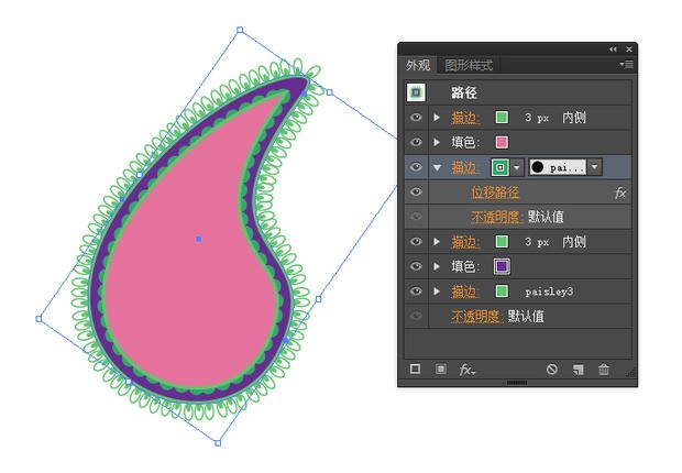 添加新描边,可以复制旧有的1.5px的paisley3描边,然后将复制后的描边放置于粉红色填充的下方,将该描边变为paisley1,颜色换为另一种绿色。添加新效果,位移路径-17px。