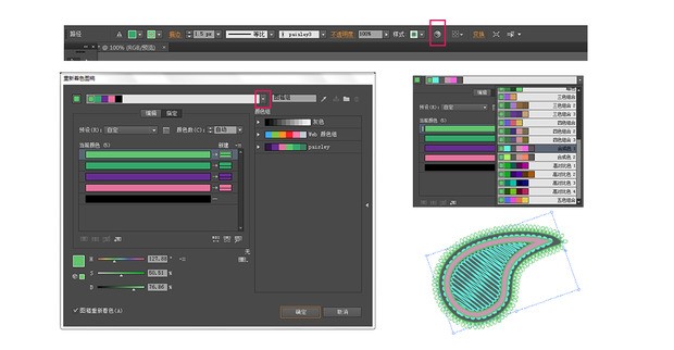 选中图形,点击工具栏上方的重新着色图稿按钮,打开重新着色图稿面板。面板当中的各种设置都是针对新的着色图稿的方案。在此,你可以在协调规则中进行着色的选择,例如我在此选择的合成色,图案的配色就跟着瞬间发生了改变。