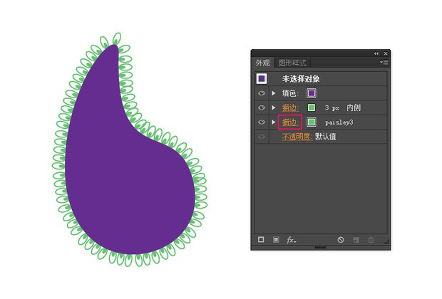 3)外观面板中的各种外观的排列层叠次序与图层的概念类似,都是在上方遮挡下方的外观。例如刚刚我设置过3px的绿色描边,这个描边放置在紫色填充的上方,而接下来增加的散点画笔描边就放置在最底层,也就是紫色填充的下方,这样就看起来仿佛两个描边合二为一。