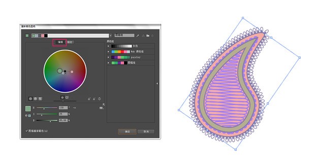 另外还有手动改变图案的色彩,在重新着色图稿面板中选择“编辑”,进入编辑选项会看到一个调色盘,调色盘里可以让你手动选择配色方案,你对调色盘中拾色器的拖动会改变下方的HSB滑块里数值,而图案也会马上显示出你的配色结果。你也可以通过移动HSB滑块来进行改变。当你对自己的配色能力很自信时,手动调整是最好的选择。