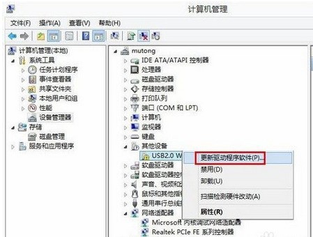 2、在“设备管理器”黄色标识的设备上,右击选择“更新驱动程序软件”;