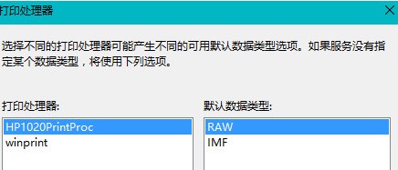 8.进入高级选项卡选择打印机处理器--打印机处理器选择(HP1020PrintProc)---默认数据类型选择(raw)。(此步很重要!)