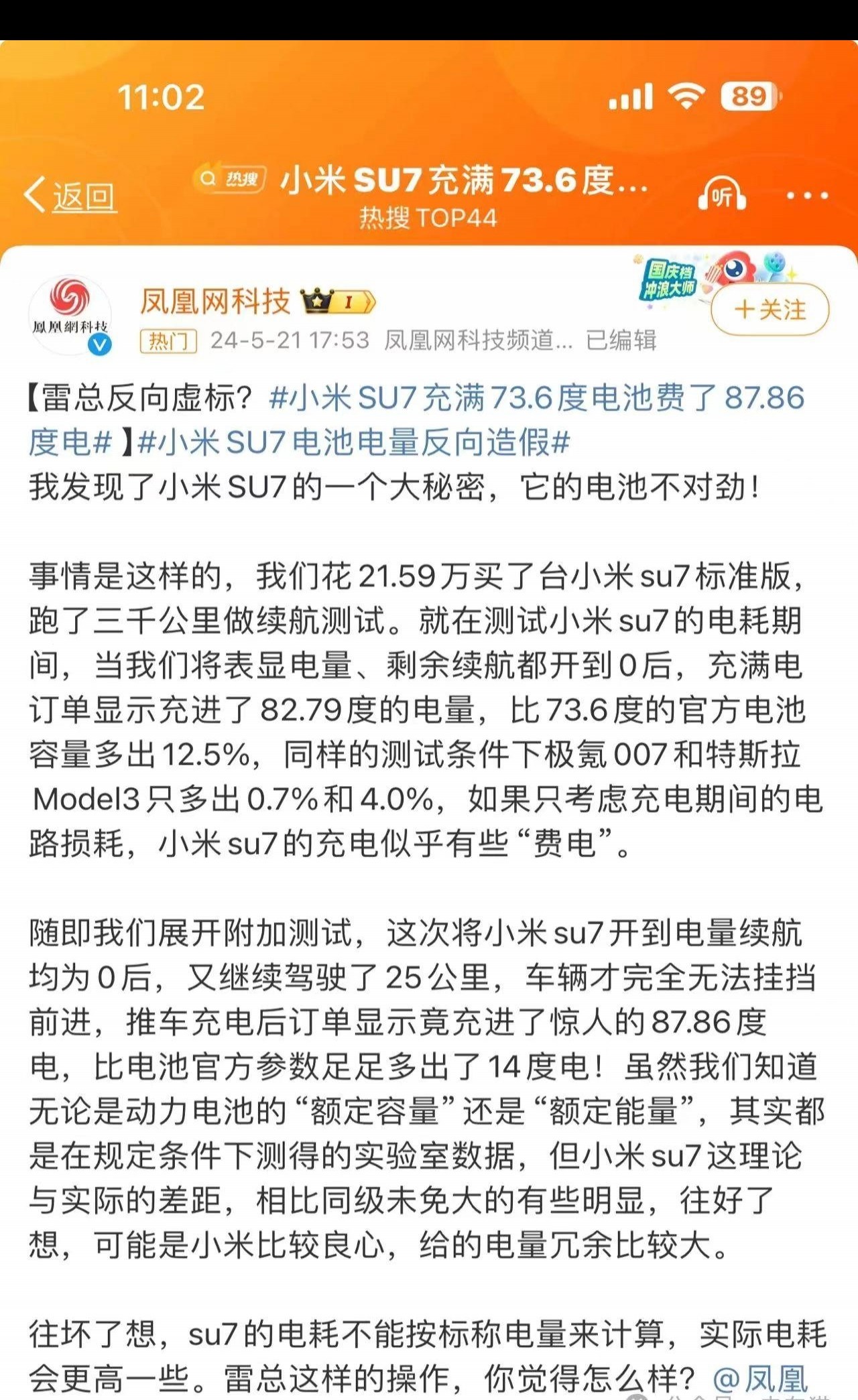 小米SU7充满电耗87.86度电,电池虚标造假?