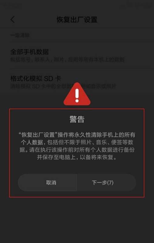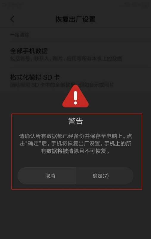 完成重置:确认已备份重要数据后,点击“确定”按钮,手机将开始恢复出厂设置,重启后即完成操作。