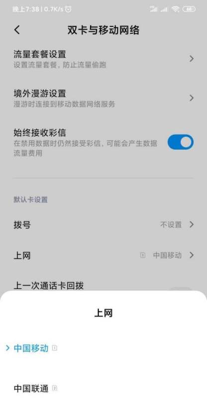 切换目标网络:在弹出的网络选择列表中,点击需要设置为上网卡的SIM卡(卡一或卡二),系统会自动切换。