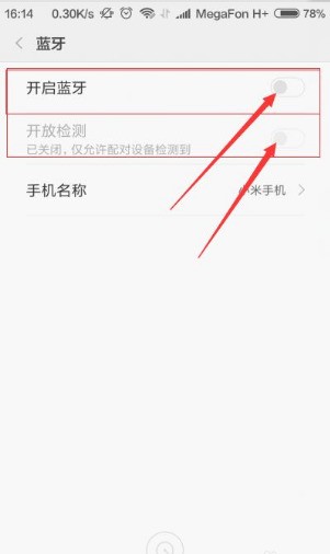 2、在打开的蓝牙设置中,点击开启蓝牙,同时蓝牙的开放检测开关同时打开。