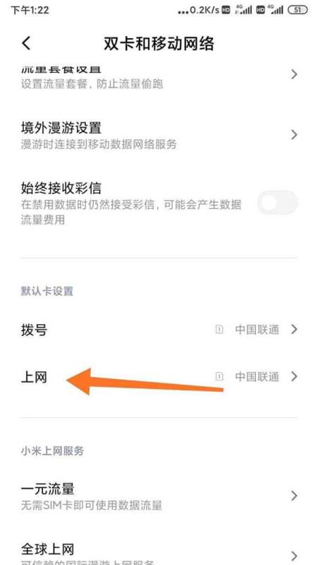 点击上网按钮:在默认卡设置中,点击【上网】选项,进入流量卡选择界面。
