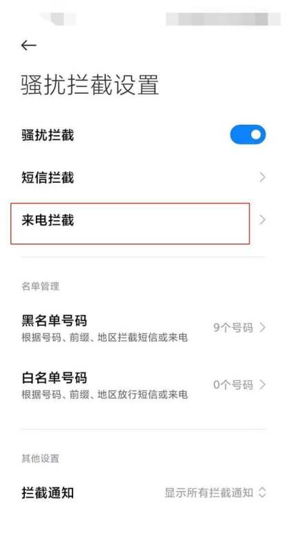 选择来电拦截规则:在设置列表中点击<来电拦截>,管理拦截相关参数。