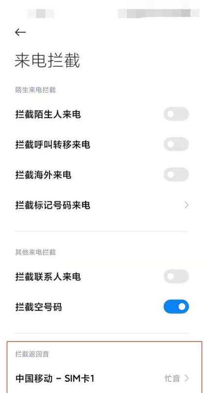 修改拦截返回音:点击<拦截返回音-卡1>(若为双卡手机需选择对应卡槽),从列表中选择返回音类型,例如<已关机>。