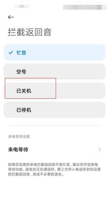 完成设置:确认选择后,系统会自动保存配置,此时拦截来电时对方将听到预设的提示音(如“已关机”)。