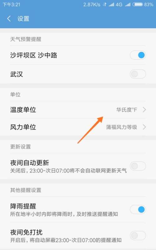 修改温度单位:在设置中找到“温度单位”选项,当前默认显示为摄氏度(℃),点击后勾选“华氏度”(℉)。