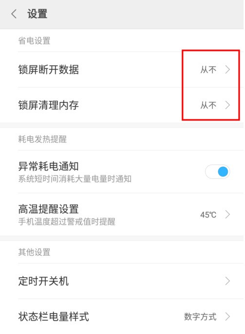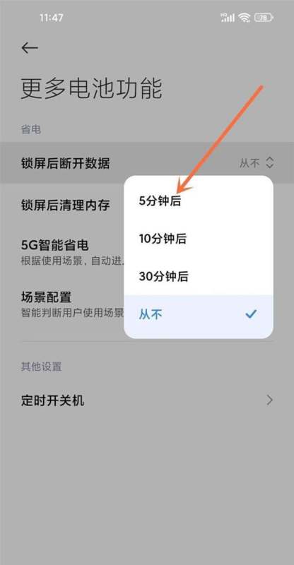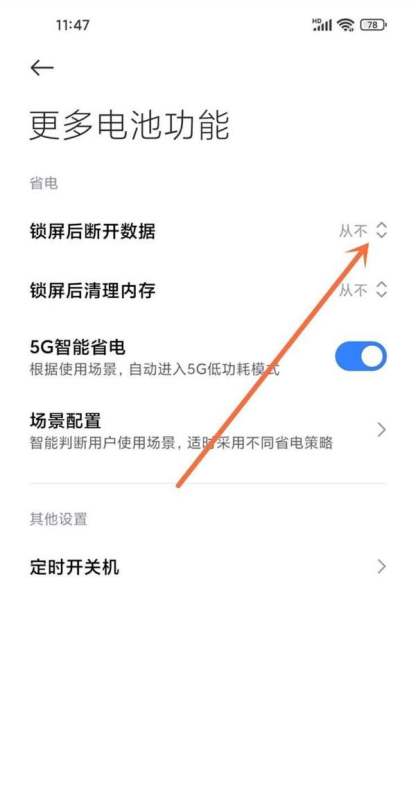 修改锁屏后断开数据选项:在省电设置页面中,找到“锁屏后断开数据”选项并点击进入。此选项用于控制锁屏后网络连接的保持时间。