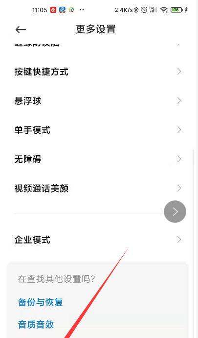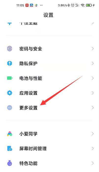 找到更多设置选项在设置菜单中滑动屏幕,选择“更多设置”进入二级菜单。