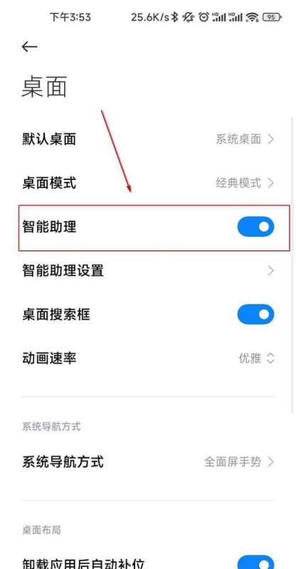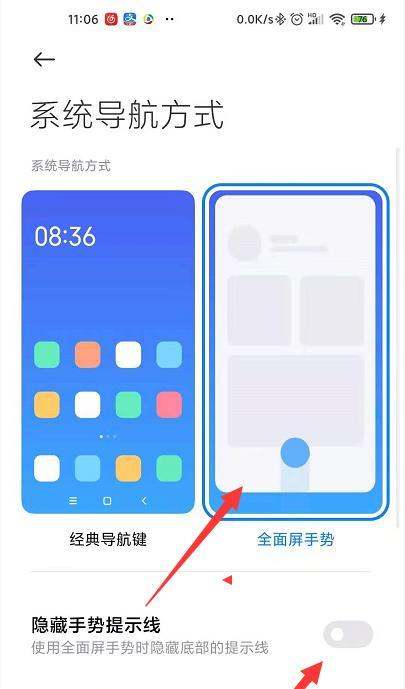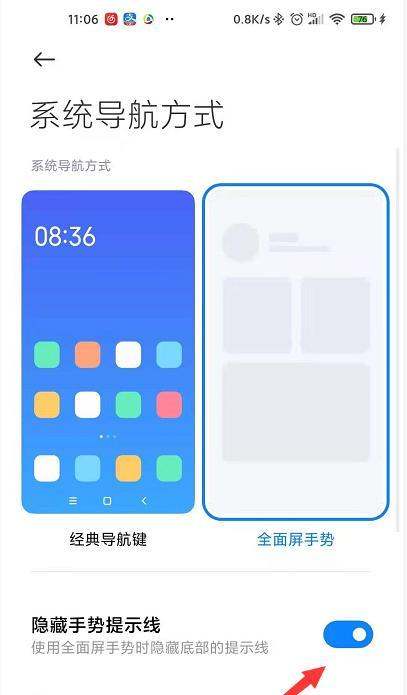 开启隐藏手势提示线选择“全面屏手势”模式后,滑动屏幕找到“隐藏手势提示线”开关并开启。