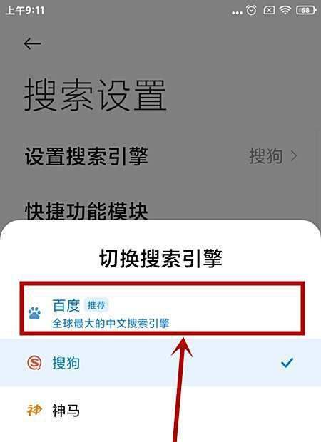 确认选择:从列表中选择目标搜索引擎(如百度),点击勾选即可完成设置。