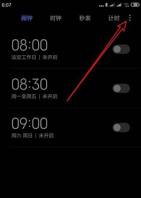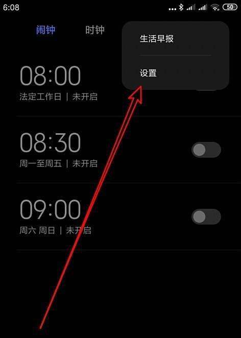 进入设置菜单:在时钟页面右上角点击“更多”按钮,弹出下拉菜单后选择“设置”选项。