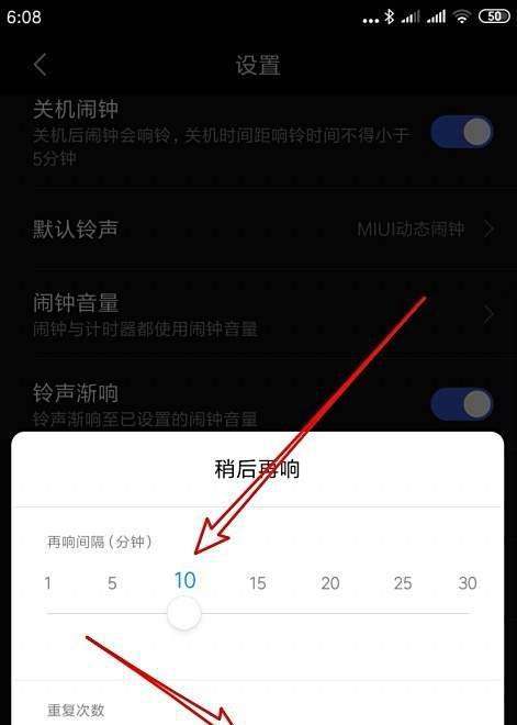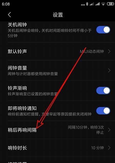 调整稍后再响间隔:在时钟设置页面中,找到并点击“稍后再响间隔”选项,进入时间间隔设置界面。