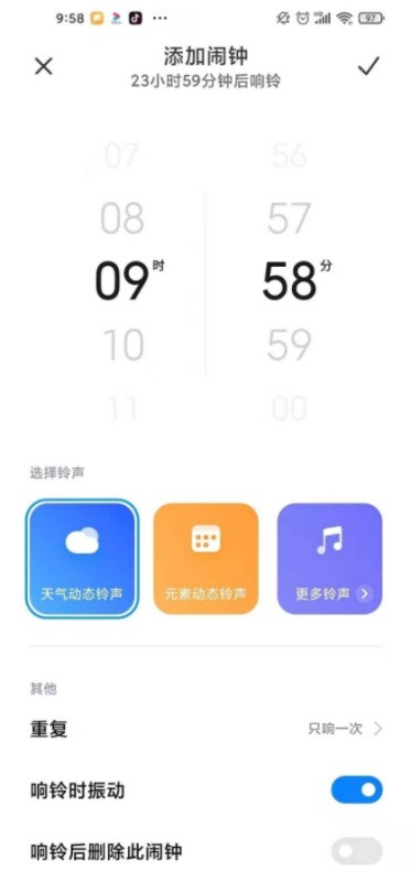 确认设置:在弹出的菜单中,选择所需的响铃间隔时间(如5分钟、10分钟等)及重复次数,点击“确定”保存设置。