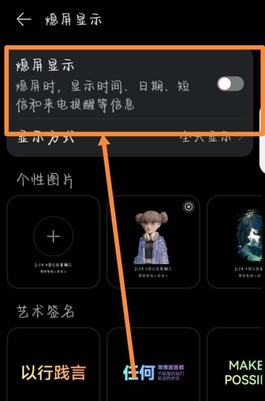 步骤三:开启功能开关在“熄屏显示”设置页面中,将顶部开关滑动至开启状态(通常显示为蓝色或绿色)。开启后,手机在锁屏状态下会自动显示时间、日期及通知图标。