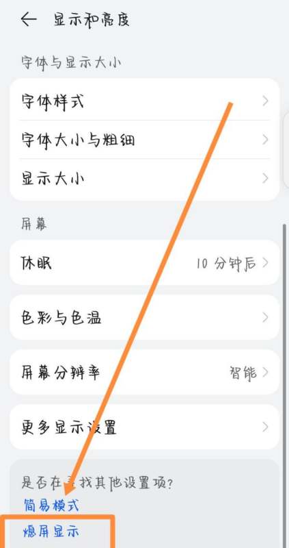 步骤二:选择“熄屏显示”功能在“显示和亮度”界面中,滑动屏幕找到“熄屏显示”选项并点击进入。该功能允许手机在屏幕关闭时仍显示时间、日期等基础信息。