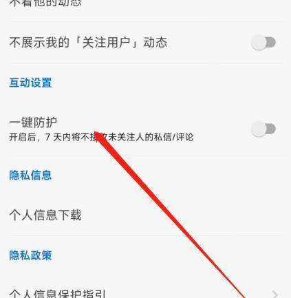 第三步:开启一键防护在隐私设置页面中,找到【一键防护】功能,点击右侧开关按钮至开启状态(显示为蓝色)。开启后,系统将自动拦截陌生私信、评论等骚扰信息。