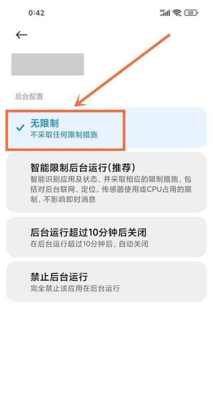 设置为无限制:在省电策略选项中,选择“无限制”模式。此模式下系统将不会对该应用进行后台限制,确保其持续运行。