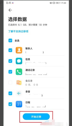 6、连接成功后进入迁移数据选择界面,选择好要迁移的数据后,点击开始迁移即可。