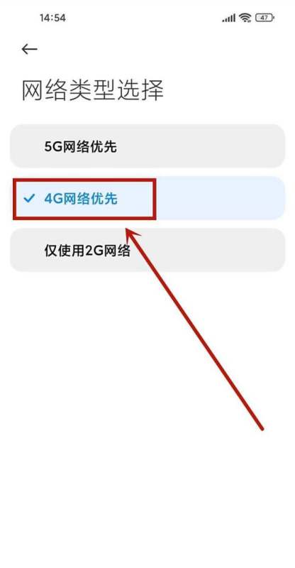 第四步:设置为4G网络优先在网络模式选项中,选择4G网络优先(部分机型显示为“4G优先”或“仅使用4G网络”),保存设置后即可生效。