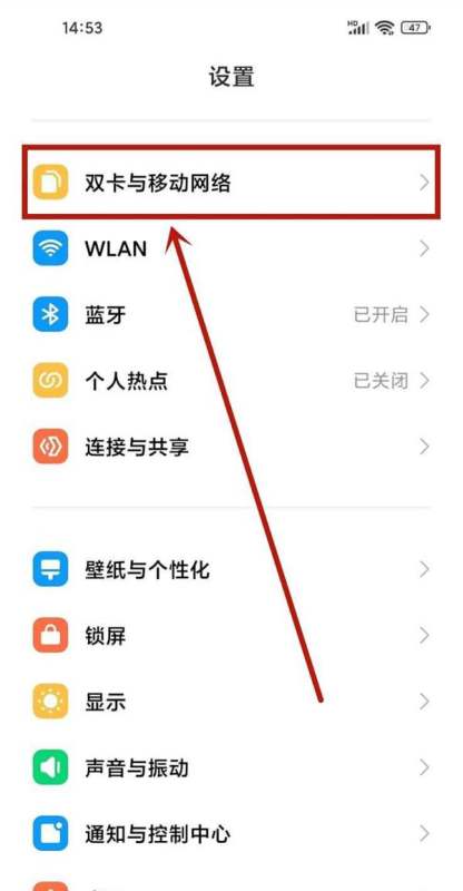 操作步骤:第一步:打开设置页面在手机主界面找到并点击设置图标,进入系统设置页面后,选择双卡与移动网络选项。