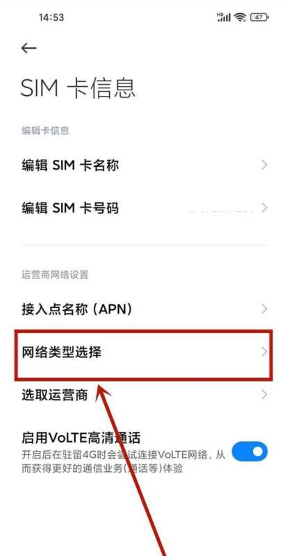 第三步:选择网络类型在SIM卡设置页面中,找到并点击网络类型选择选项,进入网络模式设置界面。
