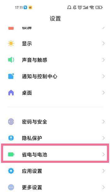 在设置页面中滑动查找省电与电池选项,点击进入该功能模块。