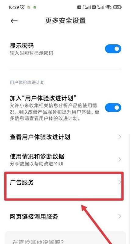 选择广告服务功能在更多安全设置界面中,找到并点击广告服务选项。此步骤直接关联广告推送的核心控制功能,不同机型可能存在命名差异(如“广告推荐”)。