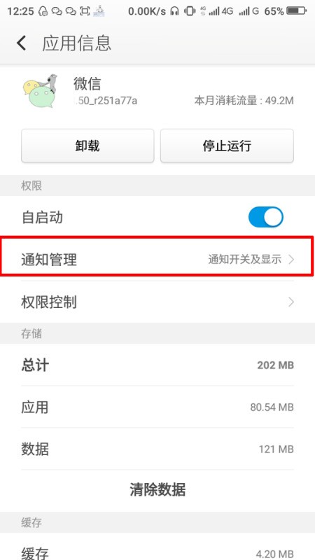 4、关闭通知再打开。这条消息的下面提示“触摸即可了解详情或停止应用”,那么索性点击进去,来到应用信息详情页,点击通知管理。