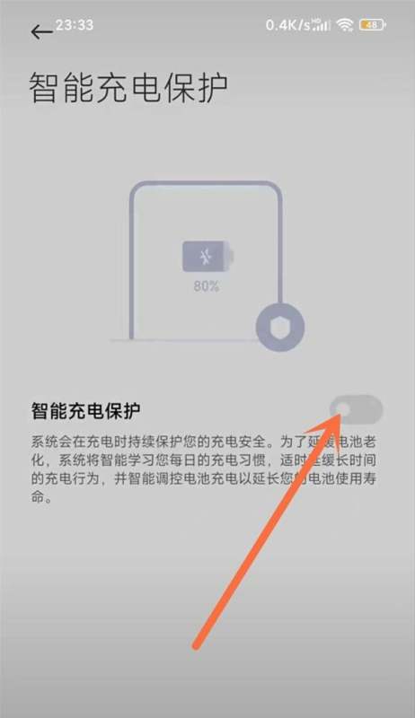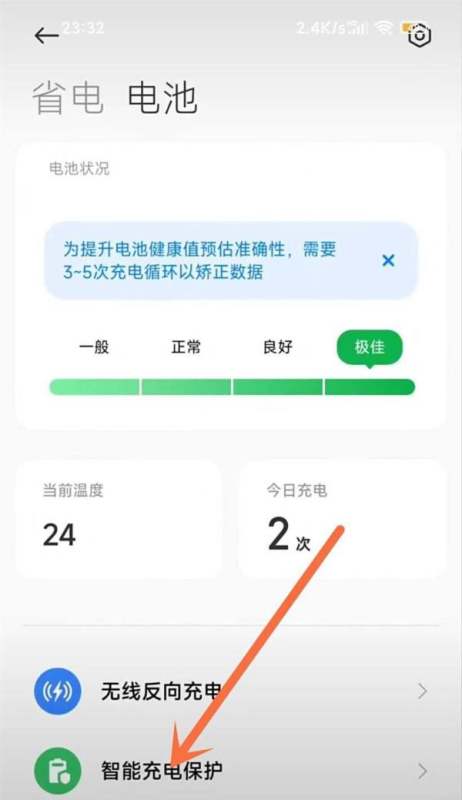 开启智能充电保护:在电池页面中找到“智能充电保护”选项,点击进入后打开右侧开关。