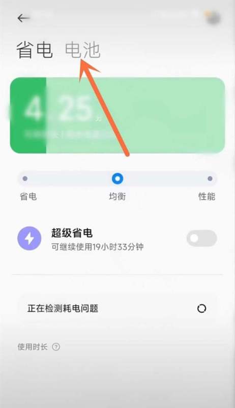 进入电池设置页面:在省电页面顶部,点击“电池”图标,切换至电池管理界面。