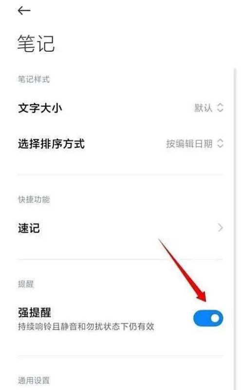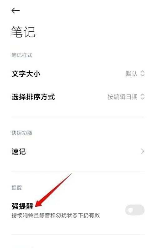 在小米笔记中设置提醒,需进入软件设置界面找到并开启强提醒开关,具体步骤如下: