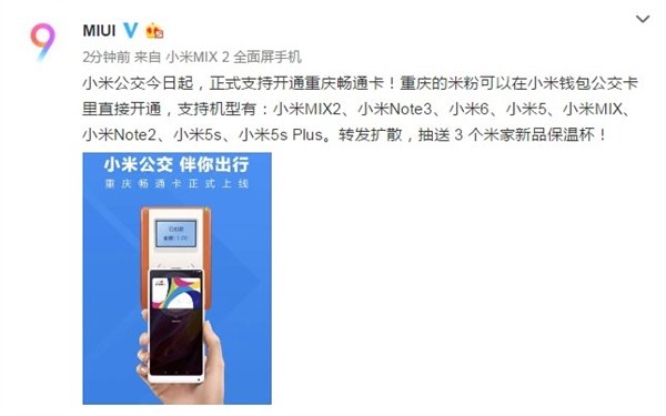 2017年12月21日,MIUI官方微博发布消息:“小米公交今日起,正式支持开通重庆畅通卡。