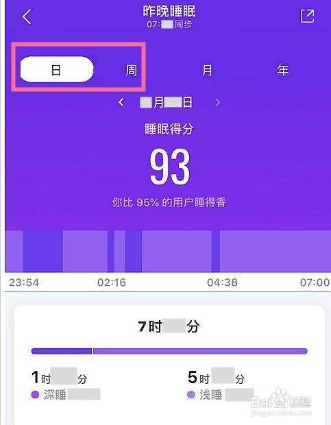 步骤3:查看周期性睡眠报告在睡眠详情页中,点击【日】可查看单日睡眠质量评分(基于深睡比例、清醒次数等指标);点击【周】可分析一周内睡眠规律,如入睡时间波动、平均深睡时长等。
