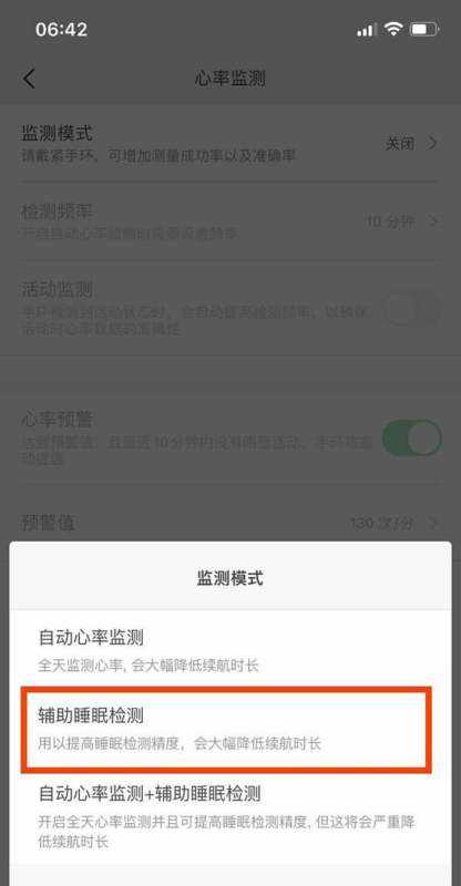 步骤4:开启辅助睡眠检测在底部弹出的模式选择窗口中,点击辅助睡眠检测选项,系统将提示该功能的作用及影响。