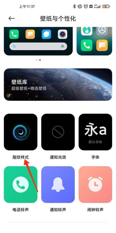 选择指纹样式:进入“壁纸与个性化”界面后,找到并点击“指纹样式”按钮。